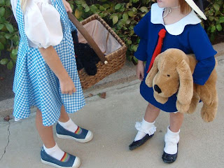 A long ago-thrifted Dorthy costume(didn’t have the red ruby shoes, but we thought the rainbow shoes were the next best thing) and a Madeline costume from three Halloweens ago. This time, we didn’t need the red bob wig.