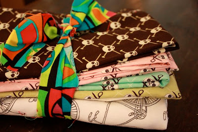 During my long, sick, couple of weeks I got an awesome care package from my good friend KathiD. Only a fellow sewer would know how a stack of fabric could raise my spirits in an instant, especially when that fabric includes skulls, sewing scissors, knitting needles and bikes.